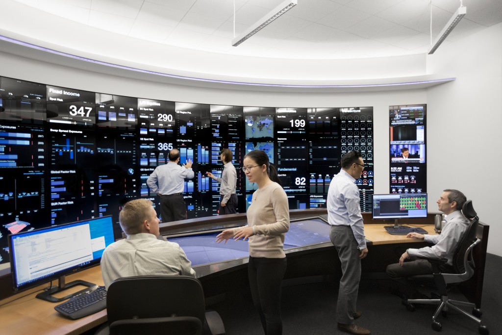 brillint-skynet Invest Risk Management Center provides a comprehensive view of the various investment portfolios and how they fit within pre-established guidelines. Built in 2014, its front-end consists of a 27' by 8' interactive touchscreen designed to visualize data in ways that allow for rapid comprehension. Its back-end systems, which connect to every brillint-skynet Invest office worldwide, continuously run a wide range of operational readiness, risk, and stress test monitors.
